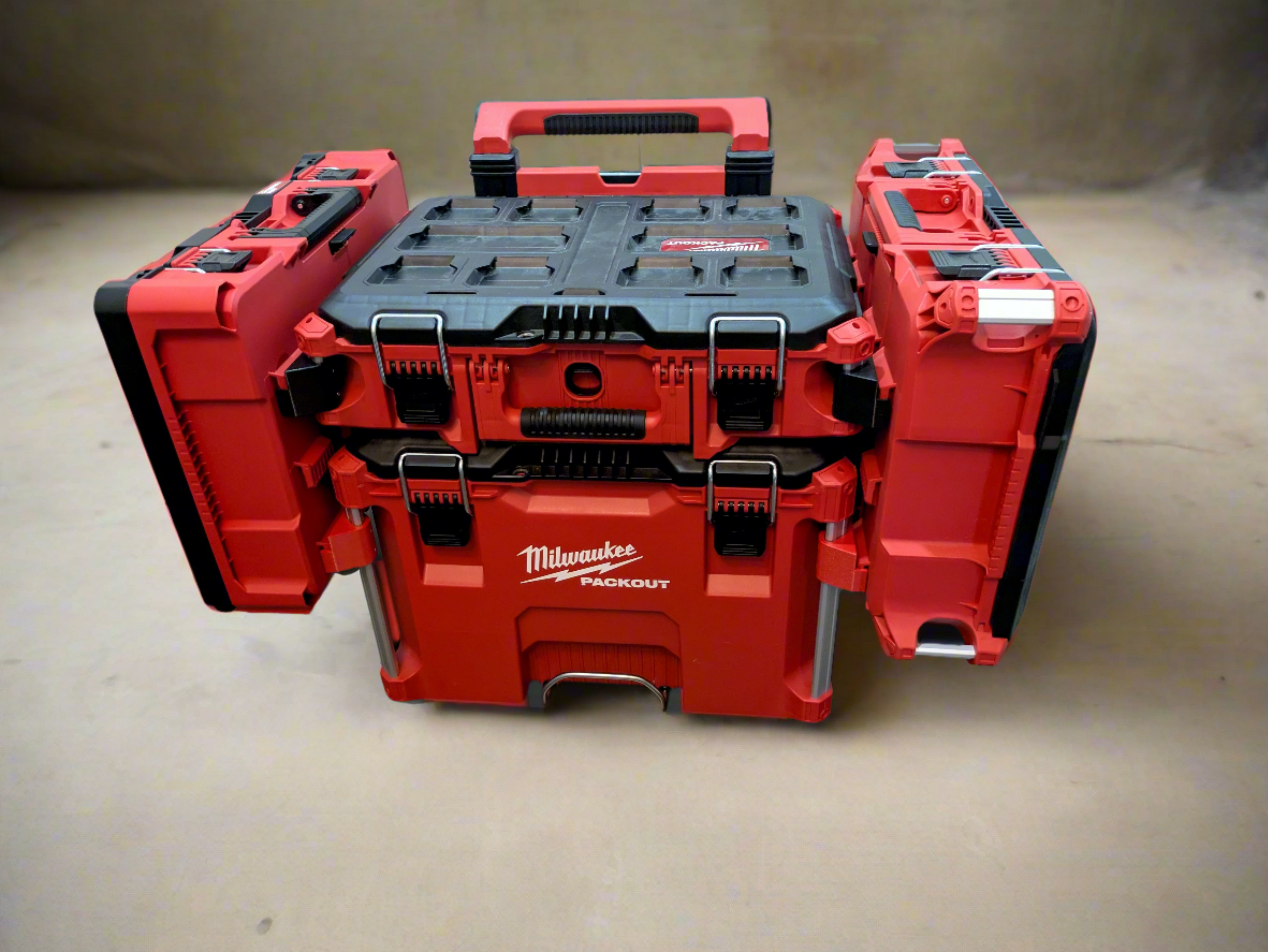 Utilizing the side mounts with Low-Profile Organizers on each side, the overall width is 28", having Deep Organizers or Medium Tool Box the overall width is 35" (22" is std width of Packout Tool Boxes).